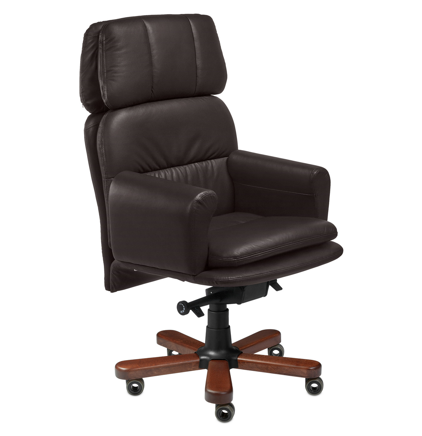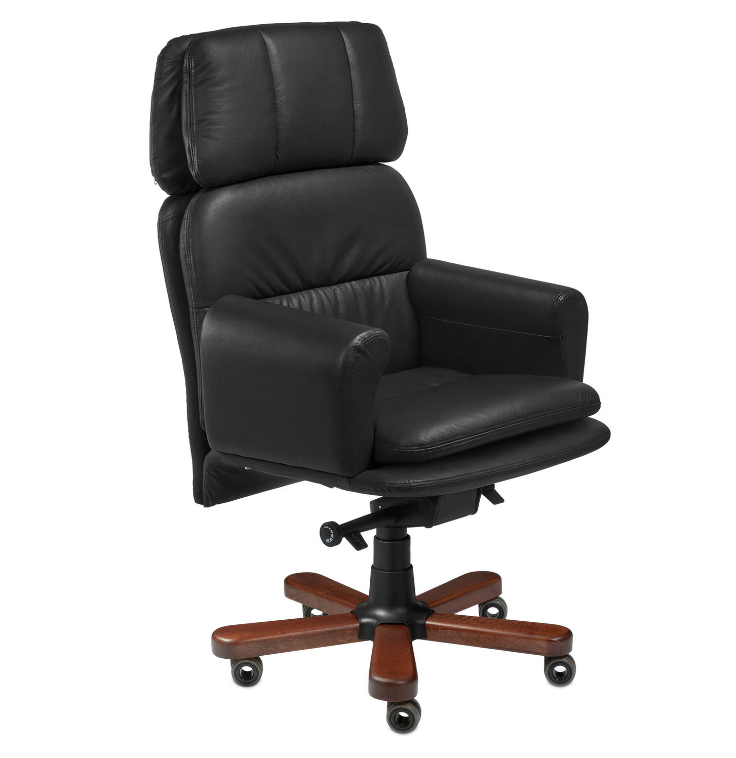Кресло руководителя FAUST B - эксклюзивная модель из натуральной кожи для приёмных и переговорных зон. Выполняется с низкой спинкой, удобным подголовником, "Г"-образными подлокотниками и деревянными накладками на крестовине. Подлокотники - мягкие, обтянутые натуральной кожей. Спинка и сидение уложены в фанерованный ковш, с внешней стороны обтянутый высококачественным кожзаменителем. По желанию заказчика кресло может быть выполнено полностью в коже. Дизайн кресла сочетает в себе эргономичность и функциональность.